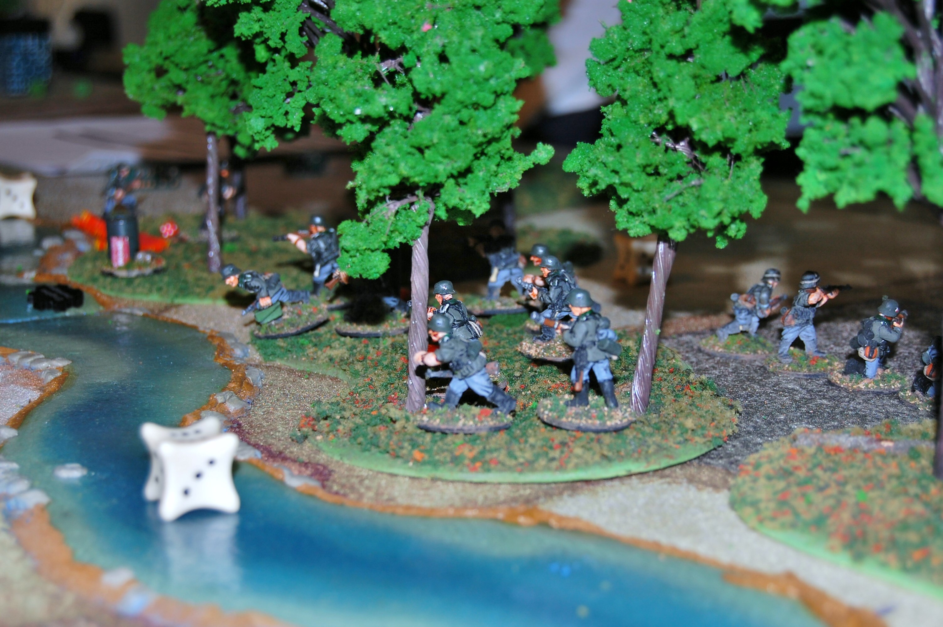 OGefr. Dietmar was ordered forward to the wood line and towards the rivers edge. Apparently this activity drew the attention of the French, for suddenly the woods were under a barrage of medium mortar fire. While little damage was done by this barrage it was to keep the 2 Gruppe pinned for the majority of the conflict.