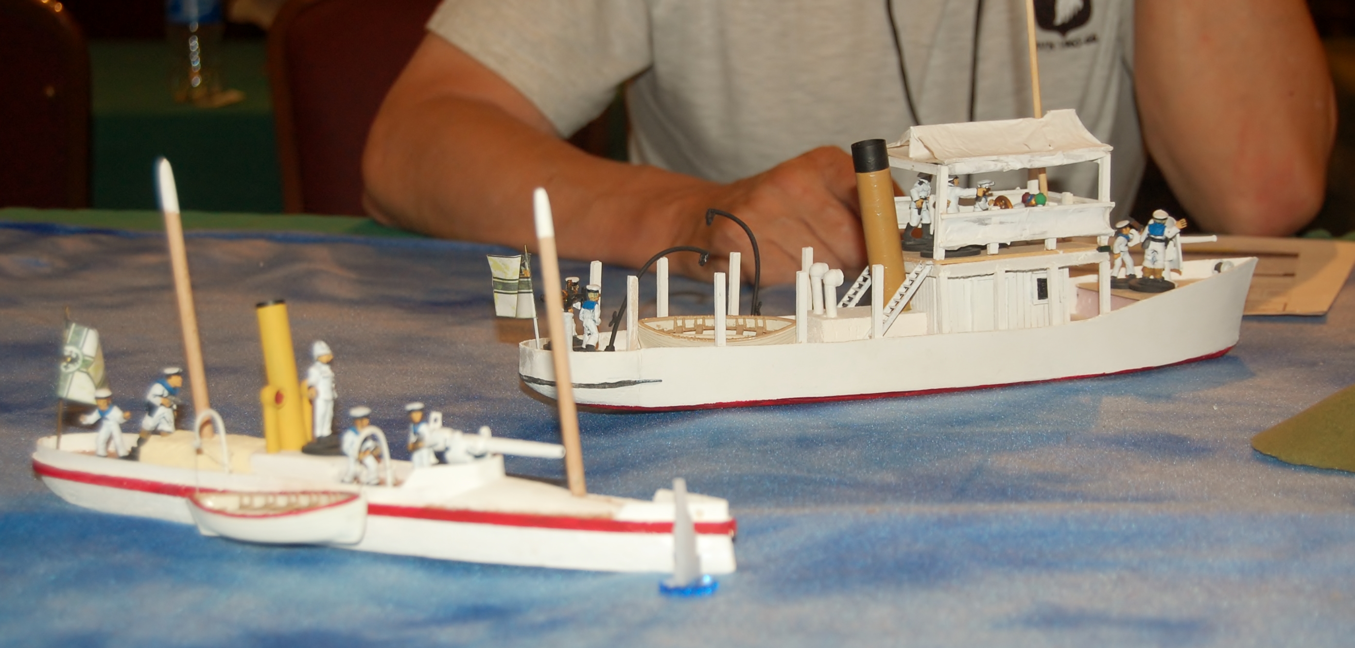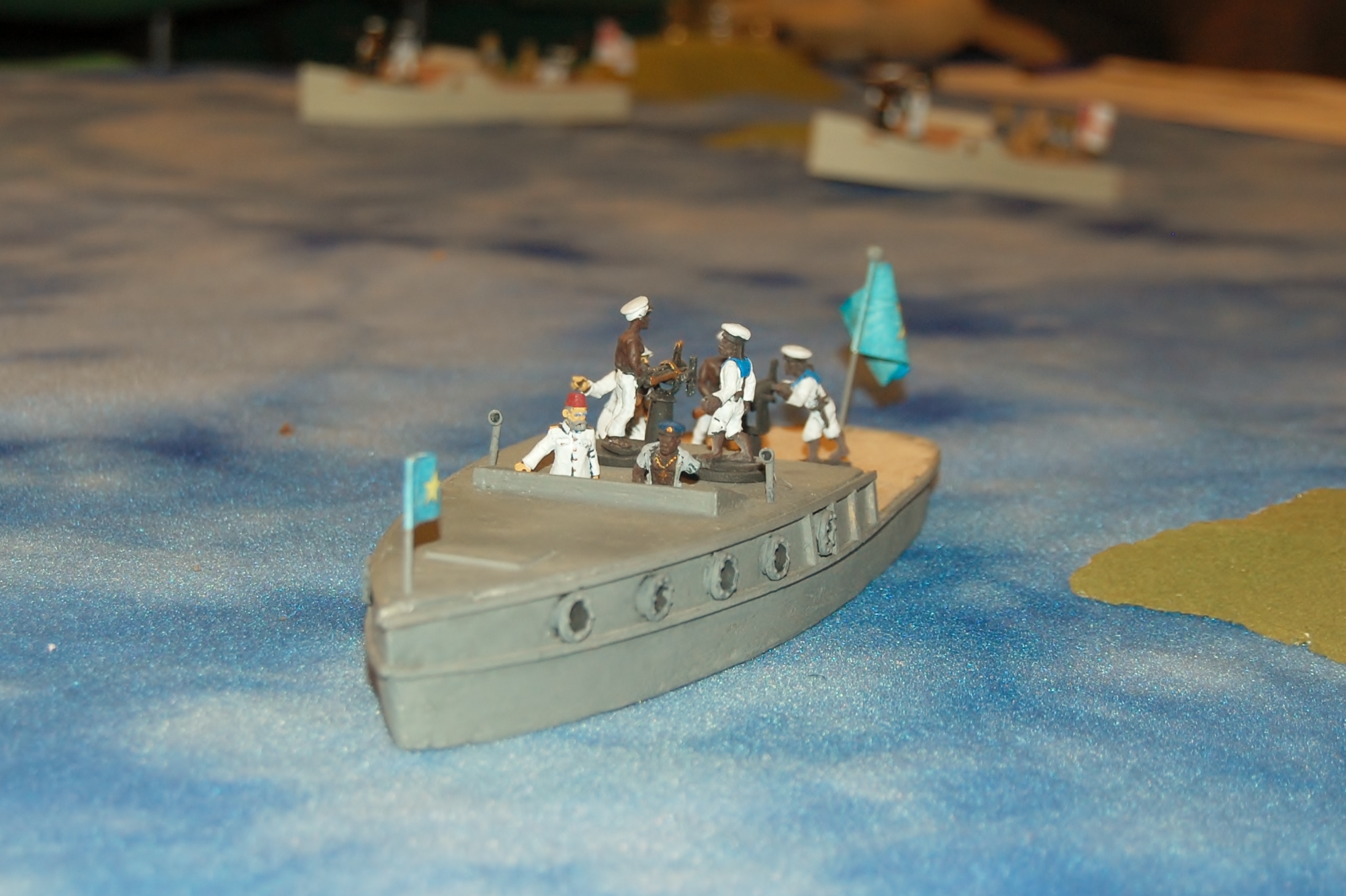 For the game I combined what were in reality two separate actions, to allow the Germans the use of both their boats instead of letting the British attack them piecemeal as happened in reality. The game was played in 28mm with most of the vessels built by myself with the exception of the British vessels the Mimi and the Toutou. These are Old Glory castings. the rules used were TVAGs Boilers and Breechloaders. A little bit of adjustment had to be made for the two British ships (which are both petrol boats not covered by the period or rules). The vessels are also over armed by the rules,, but I followed the history. That might have been an error. Having run this twice I am pretty sure that the points are not equal, giving far to strong an advantage to the British/ Belgian coalition. If I ever do this again I will need to make some changes.